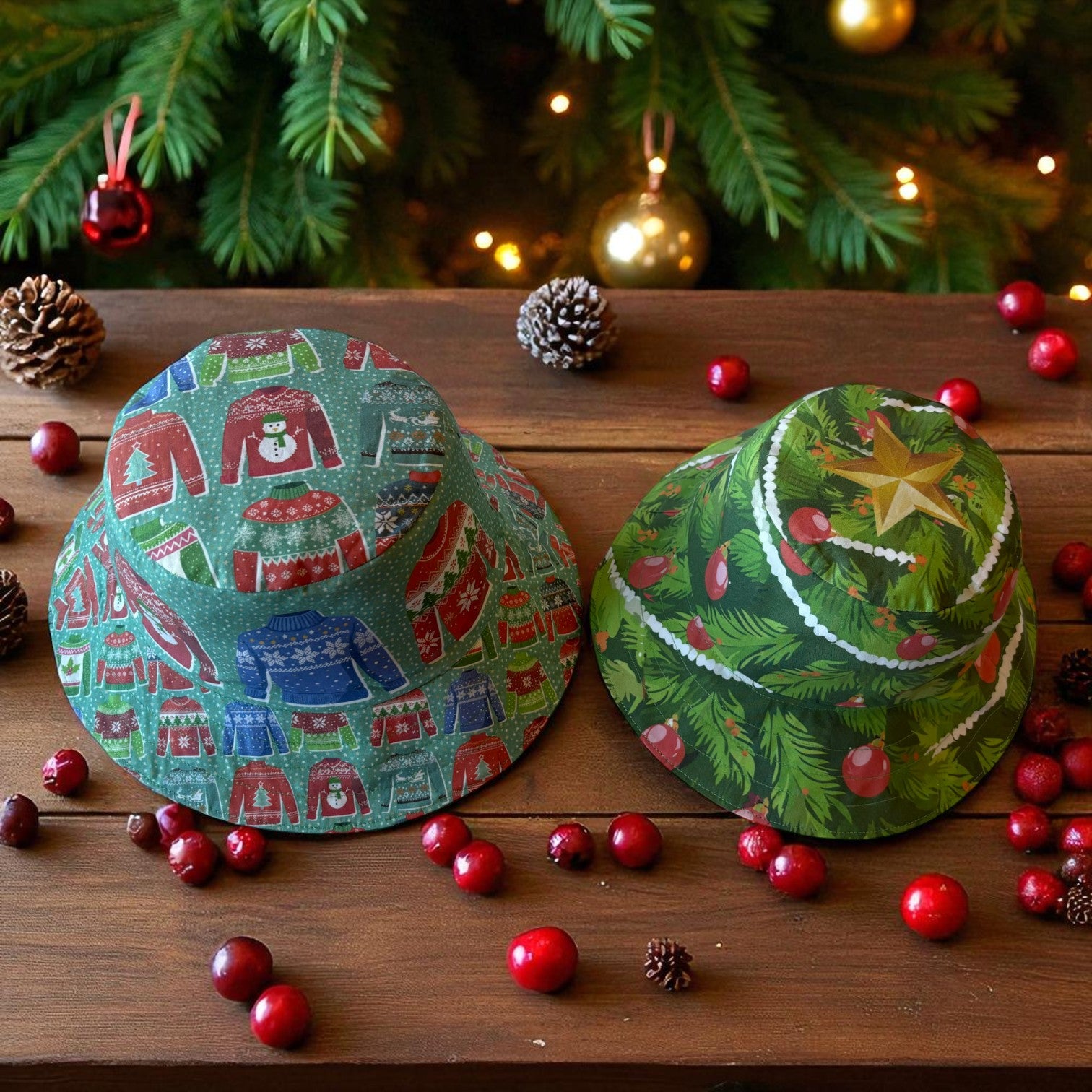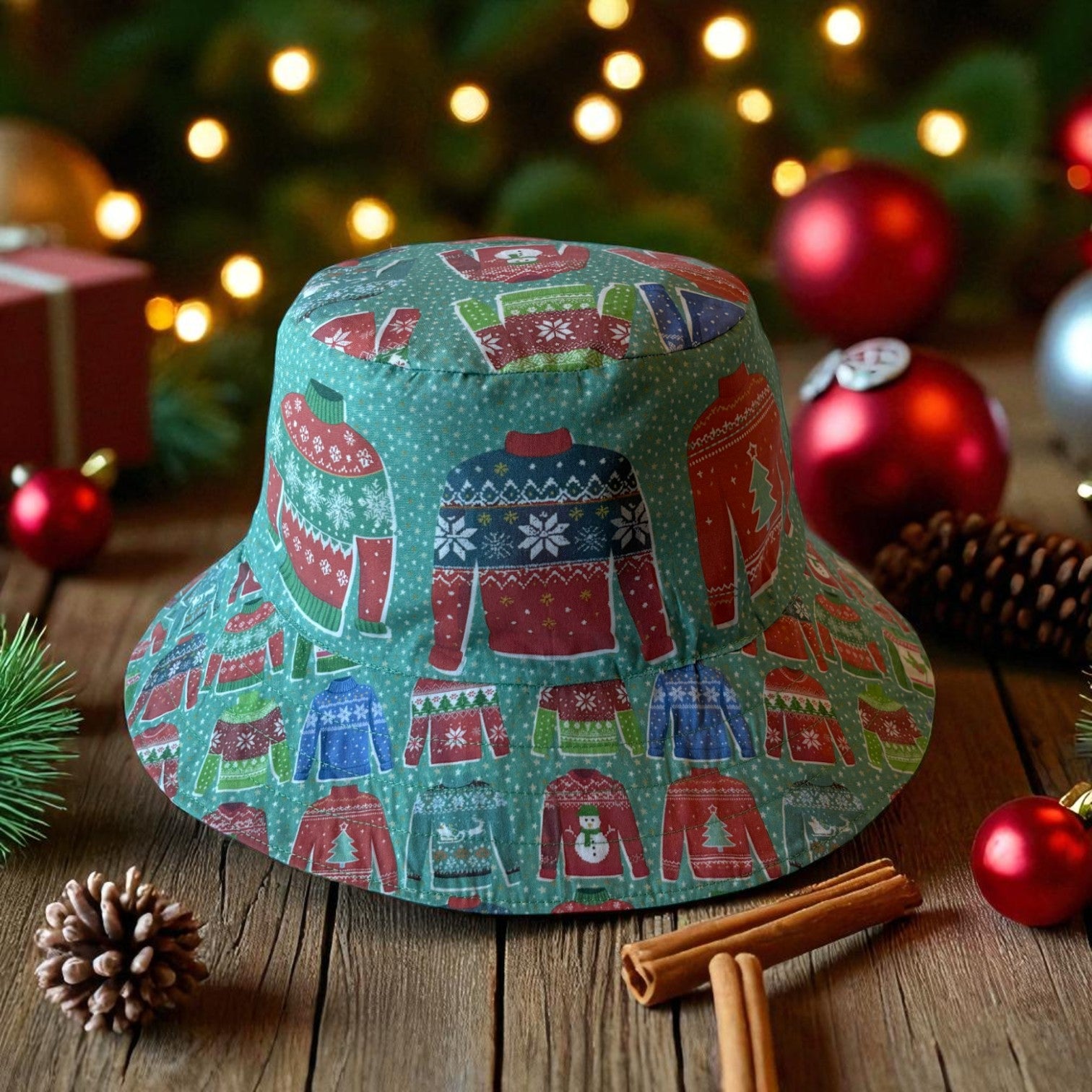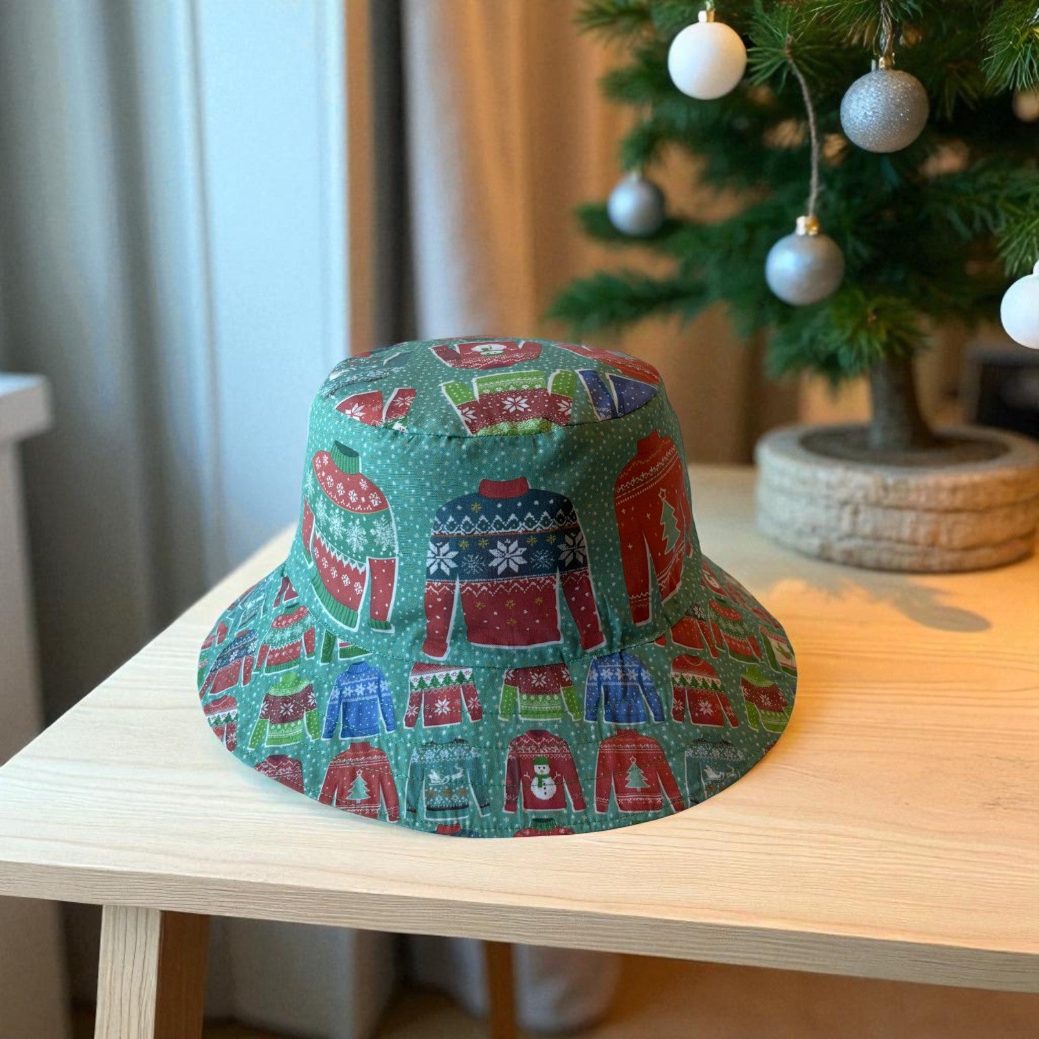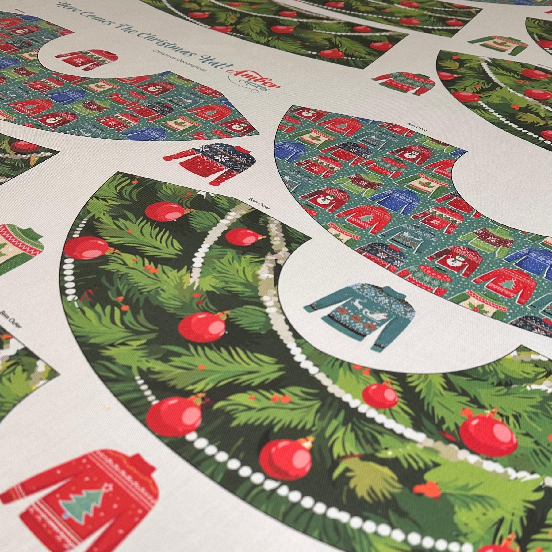 The Hat features featuring original Amber Makes illustrations of a Christmas Tree with baubles, decorations and a gold star on the top. The other side has a beautiful collection of knitted Christmas jumpers on a light green background.