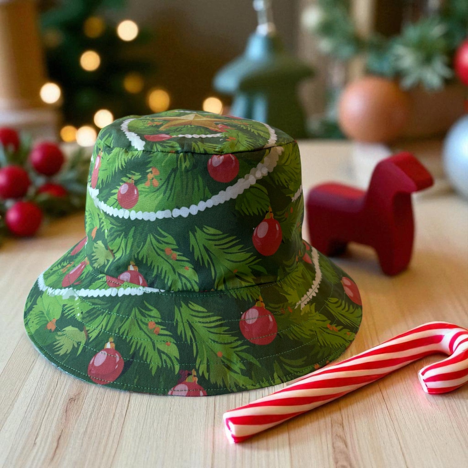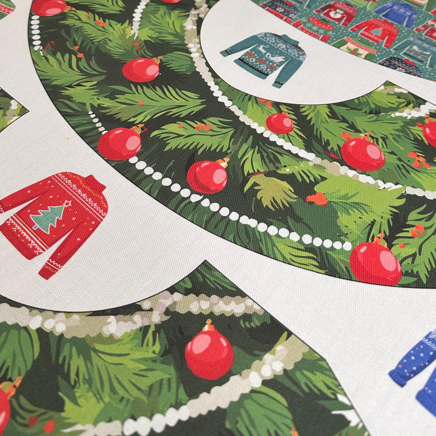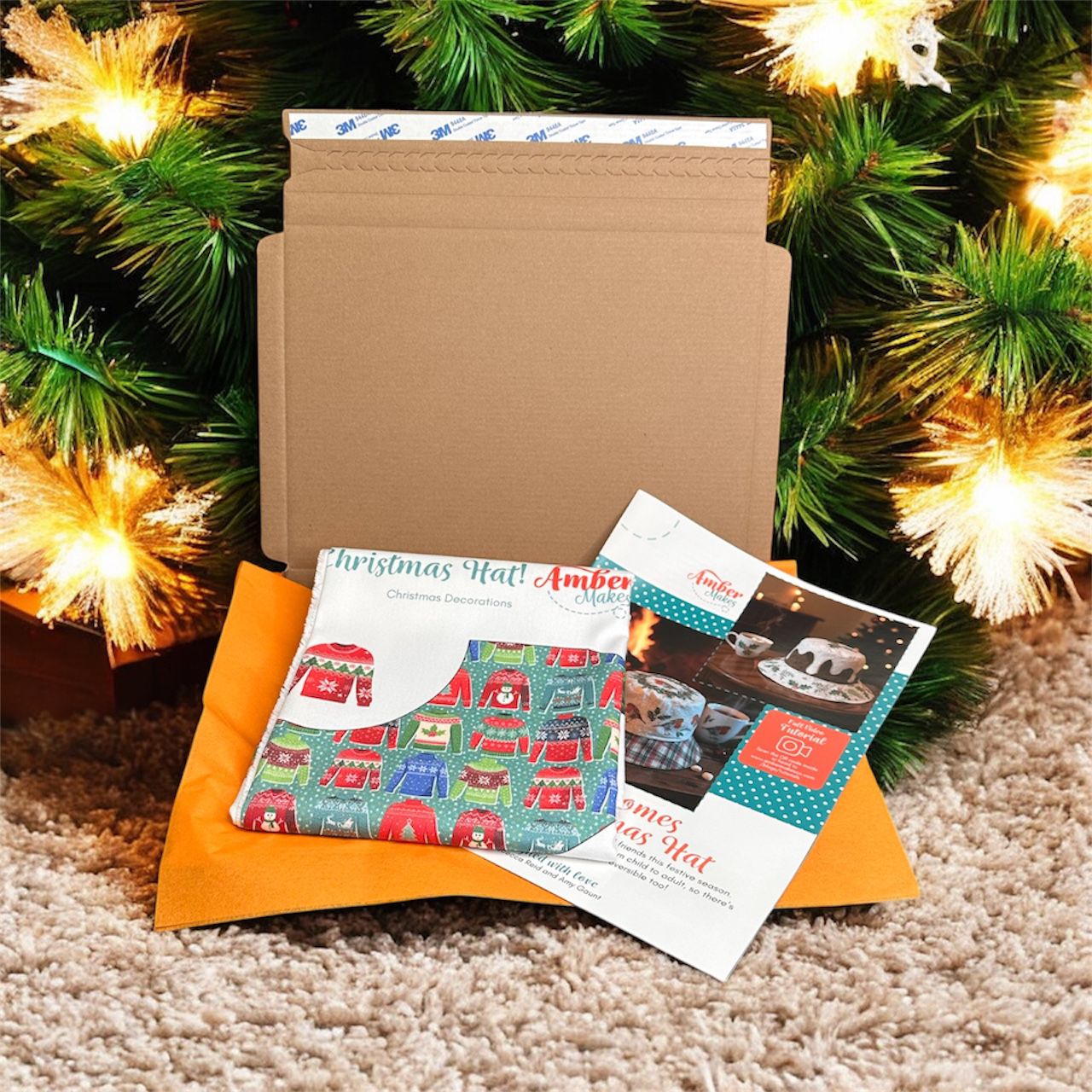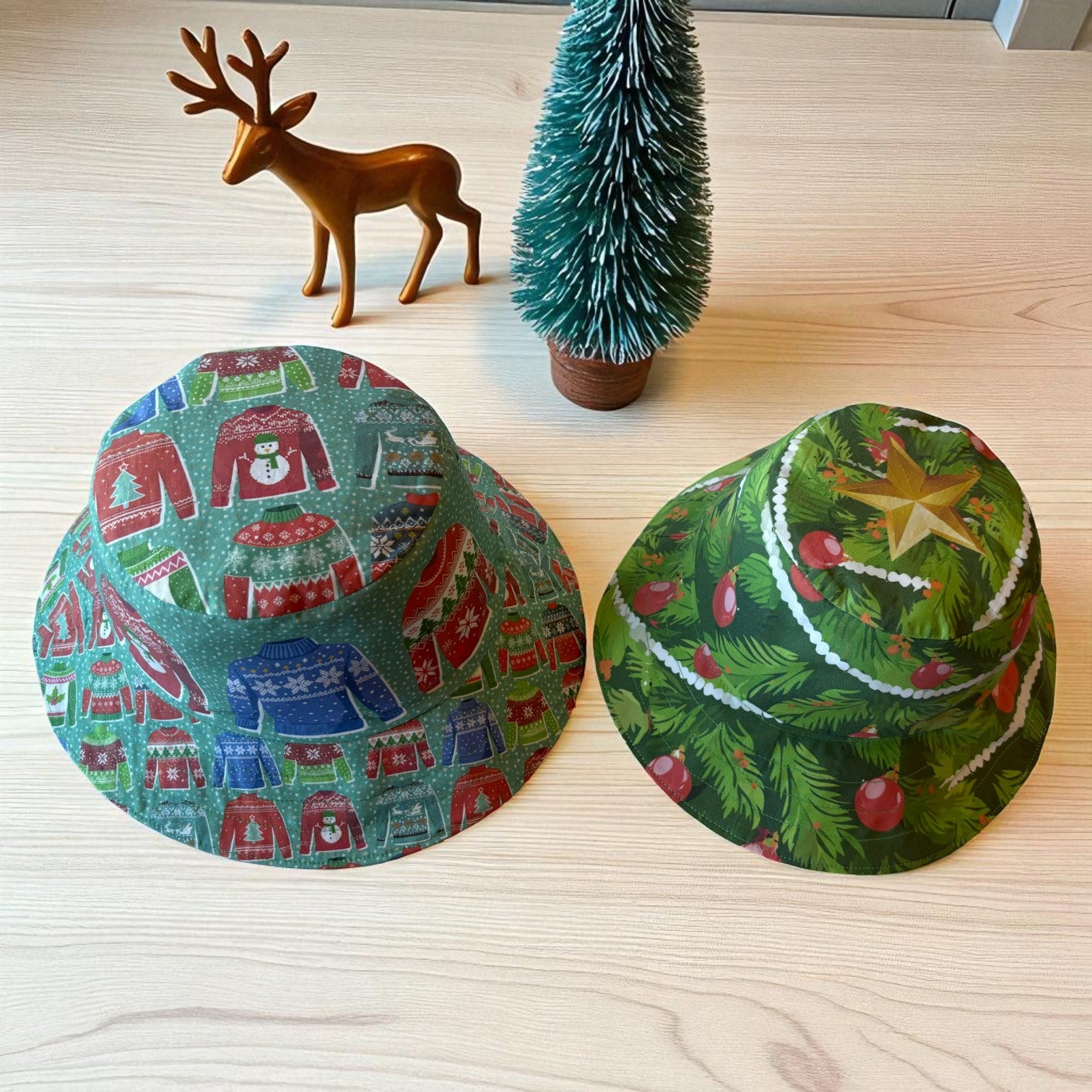 The Hat features featuring original Amber Makes illustrations of a Christmas Tree with baubles, decorations and a gold star on the top. The other side has a beautiful collection of knitted Christmas jumpers on a light green background.