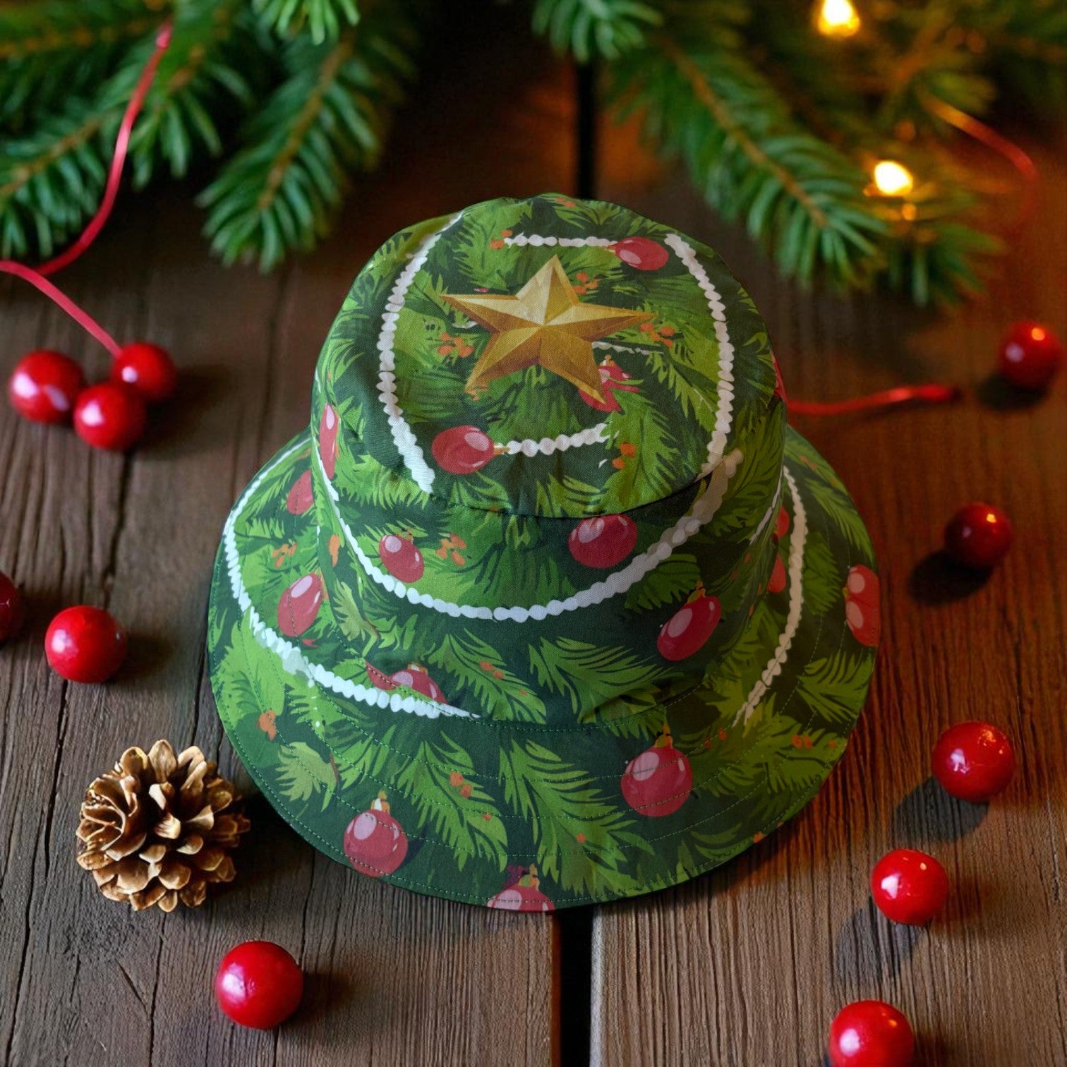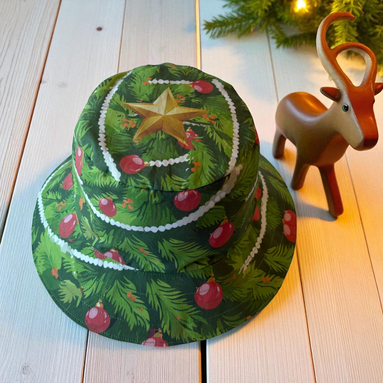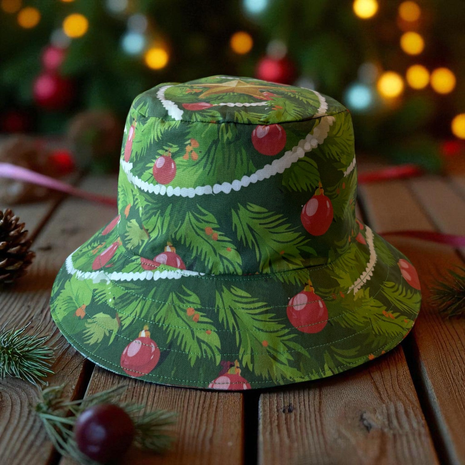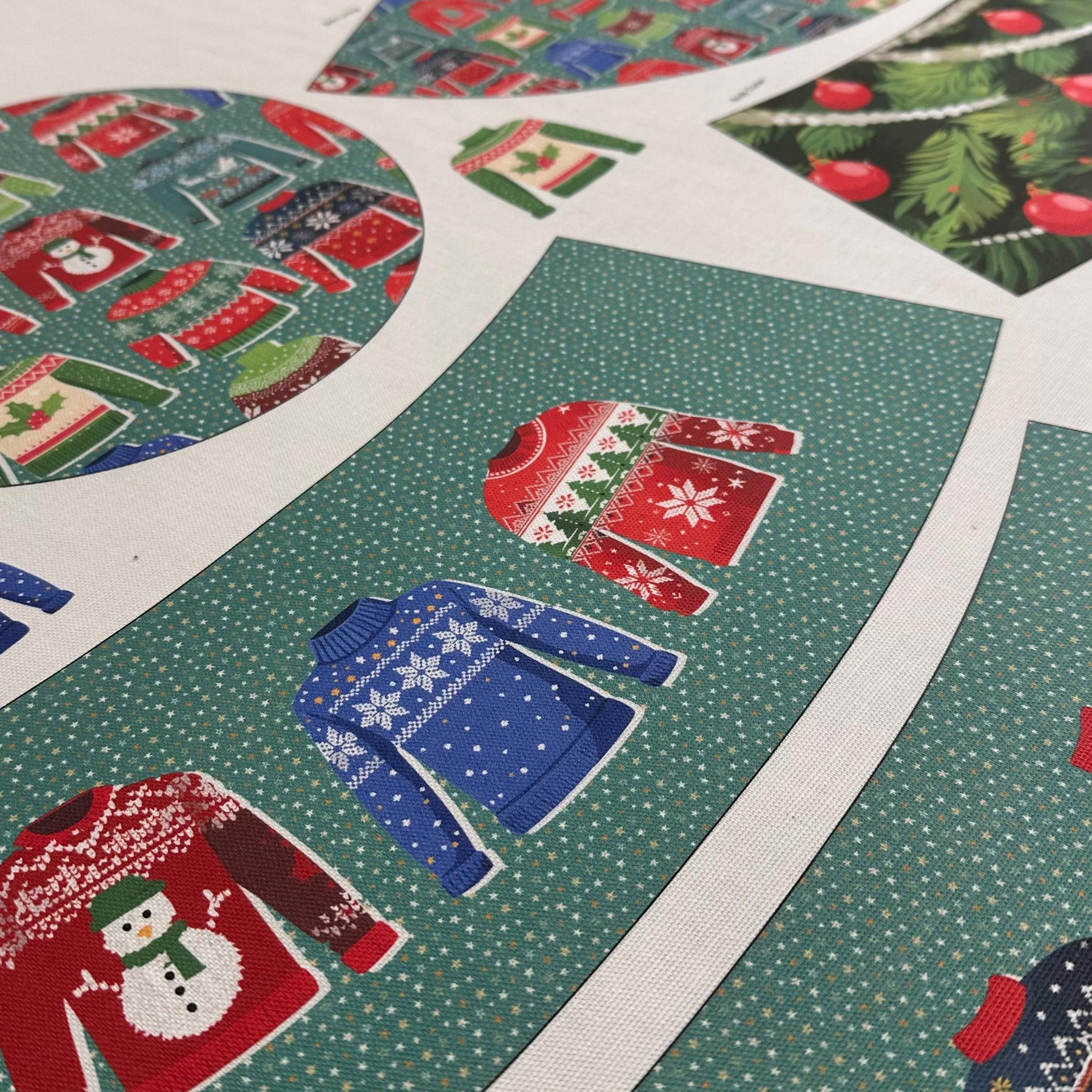 The Hat features featuring original Amber Makes illustrations of a Christmas Tree with baubles, decorations and a gold star on the top. The other side has a beautiful collection of knitted Christmas jumpers on a light green background.