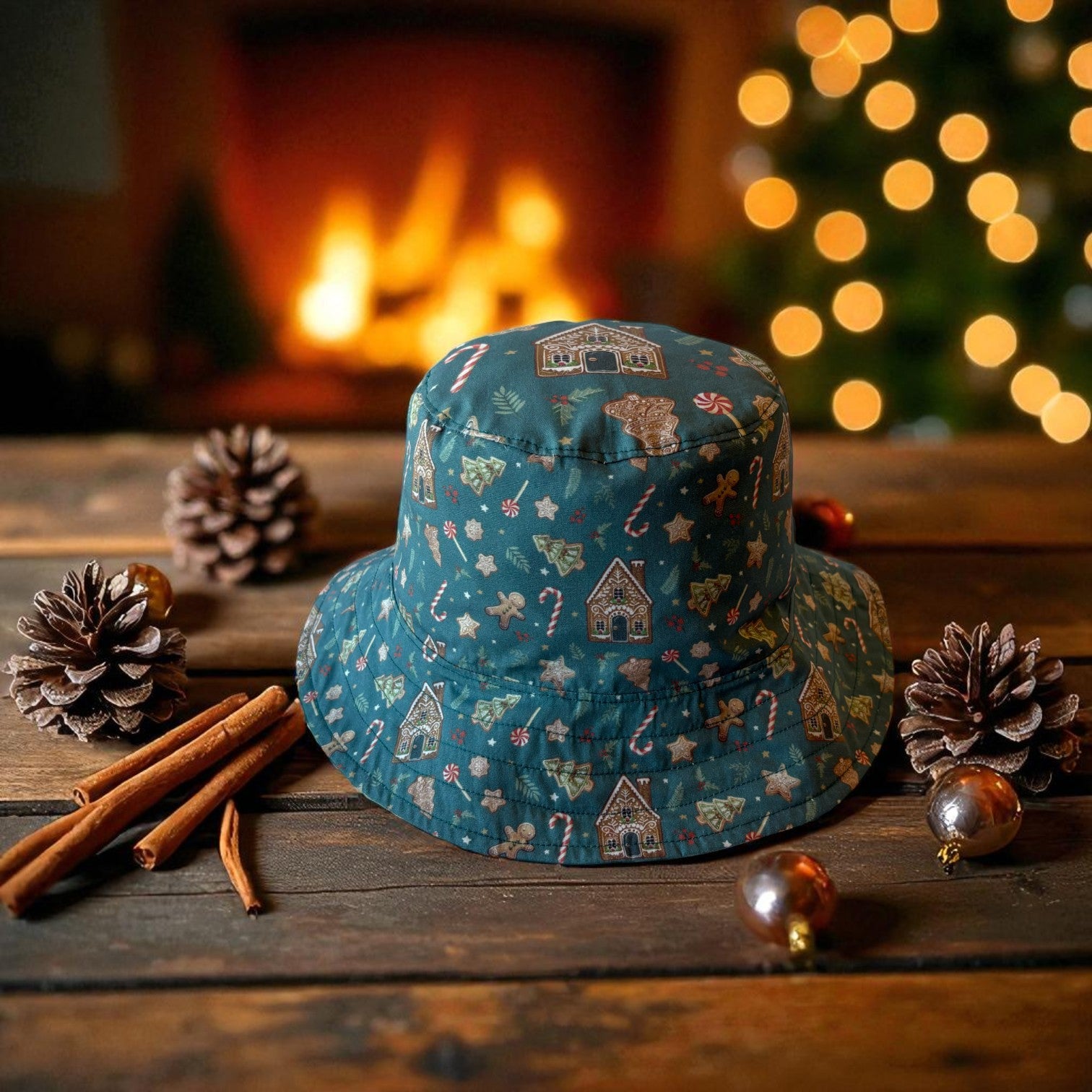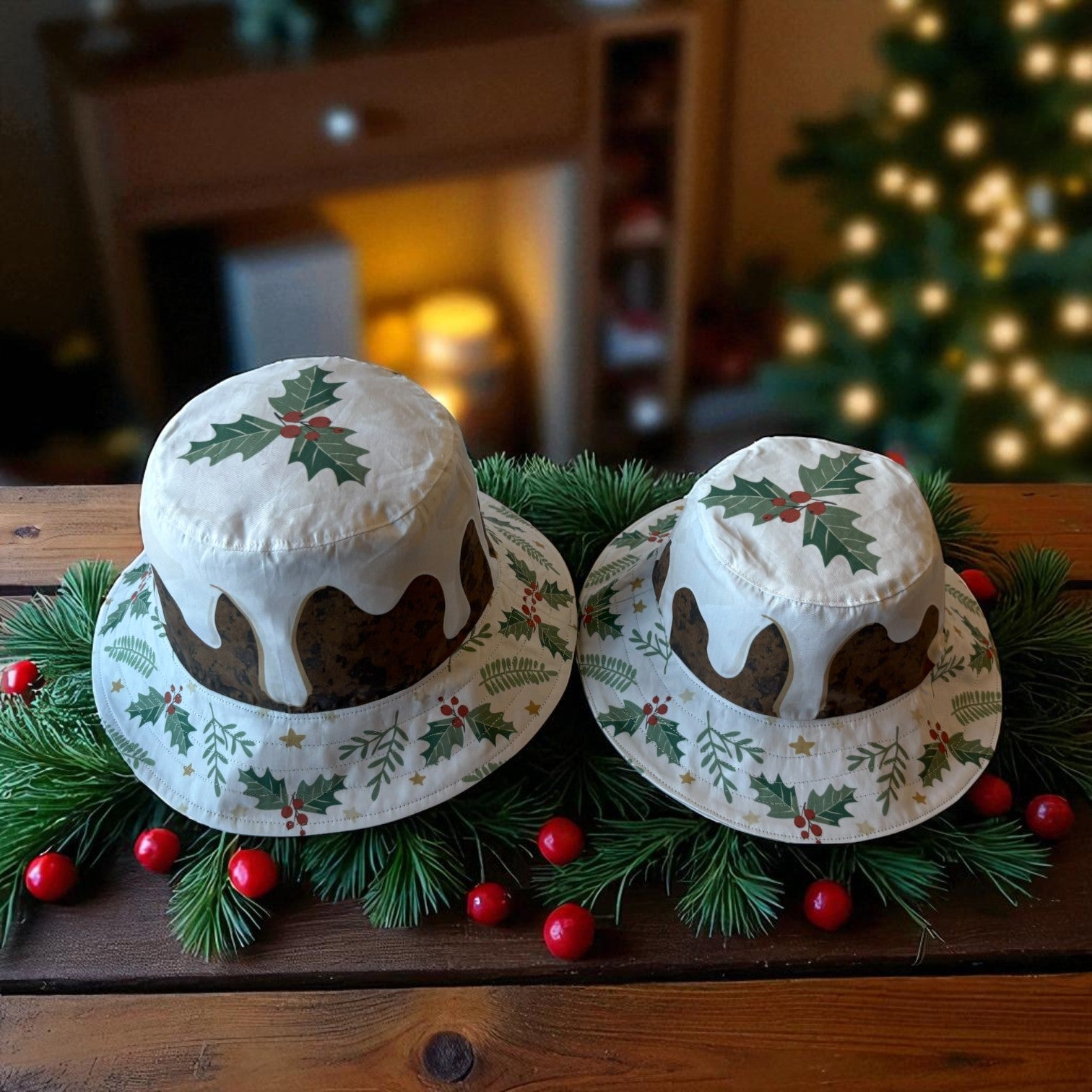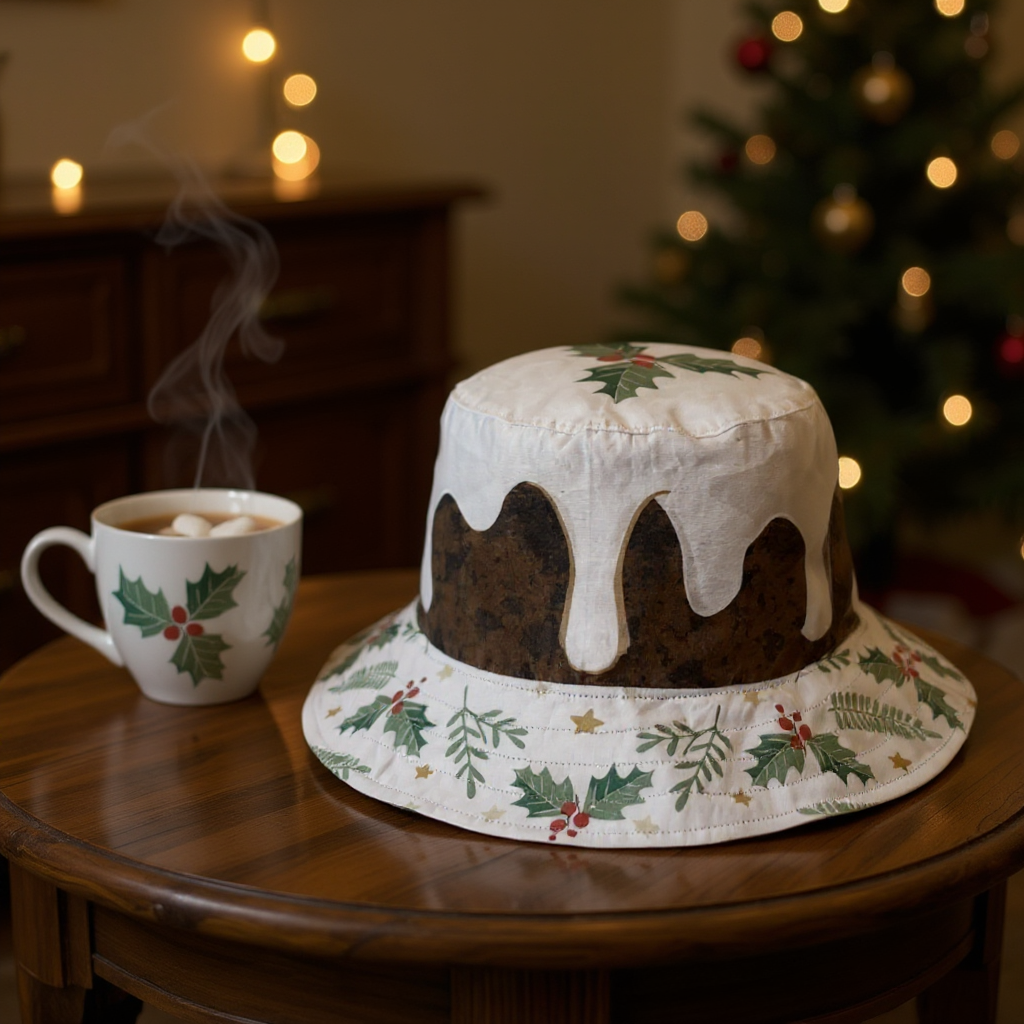 The Hat features featuring original Amber Makes illustrations of a delicious Christmas pudding with cream dripping down the side and holly on top, sitting on a festive decorated plate. The other side has a teal background print of gingerbread and candy canes.