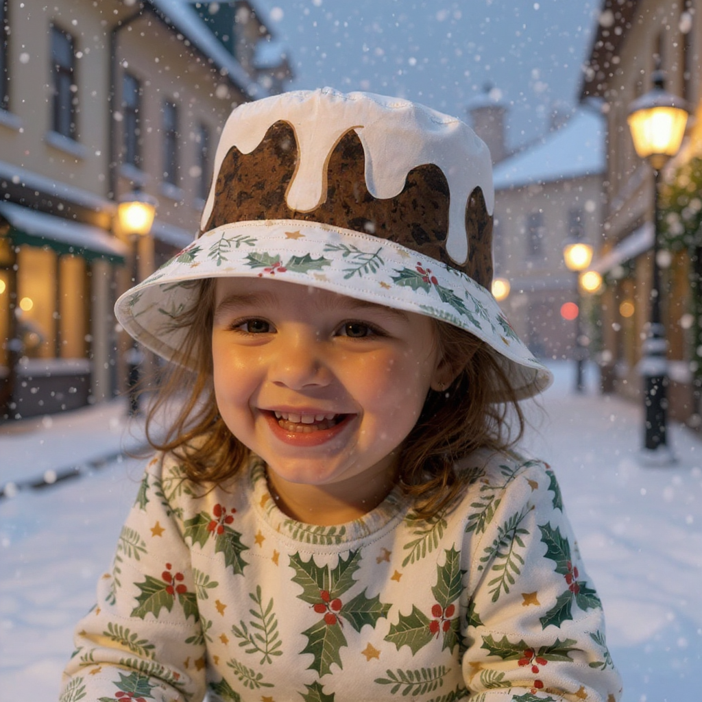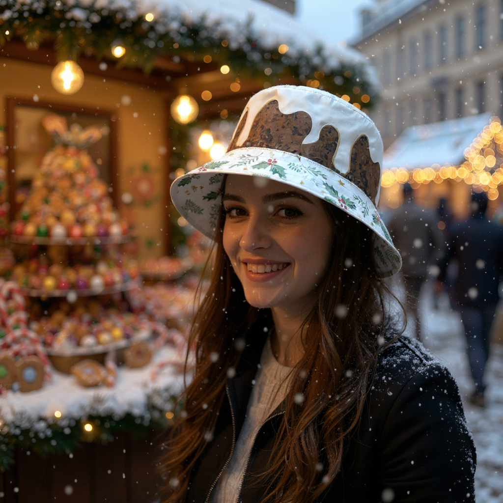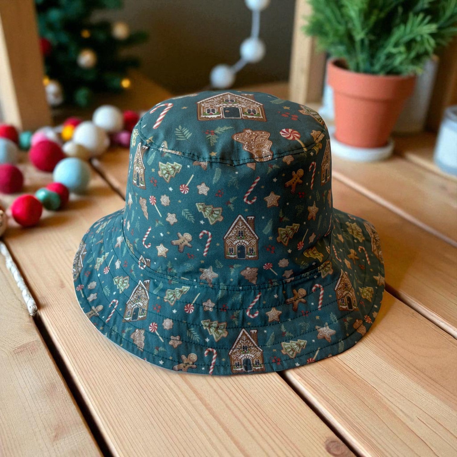The Hat features featuring original Amber Makes illustrations of a delicious Christmas pudding with cream dripping down the side and holly on top, sitting on a festive decorated plate. The other side has a teal background print of gingerbread and candy canes.
