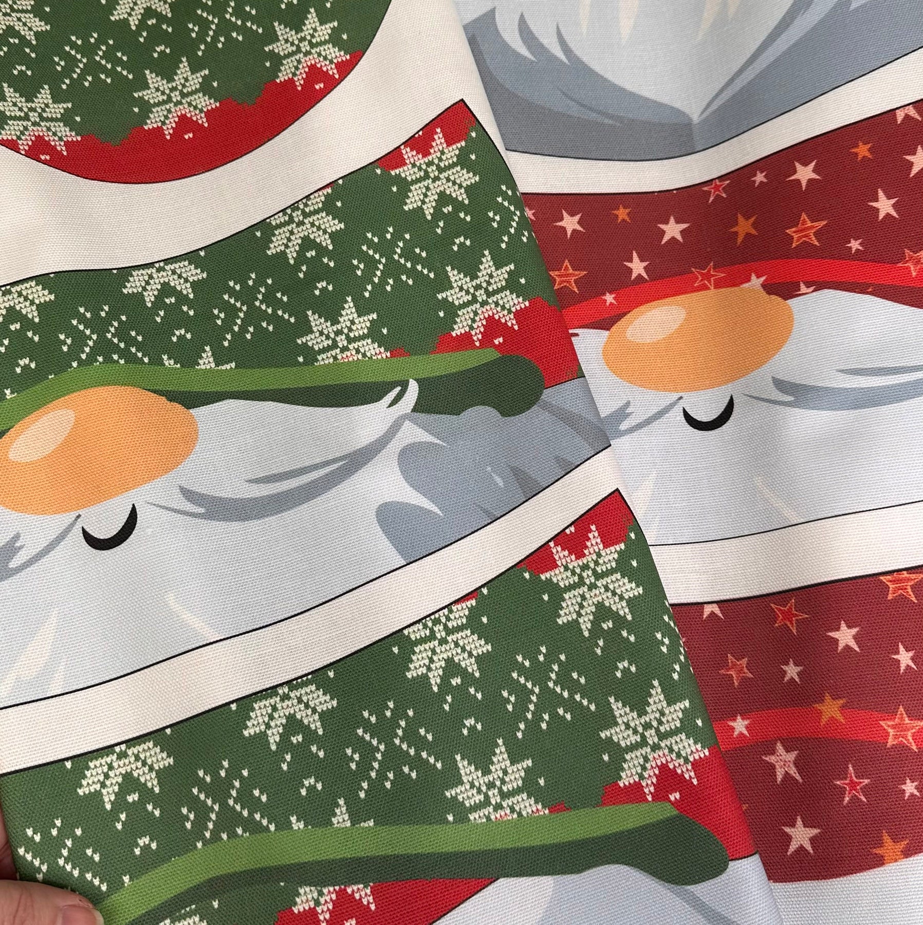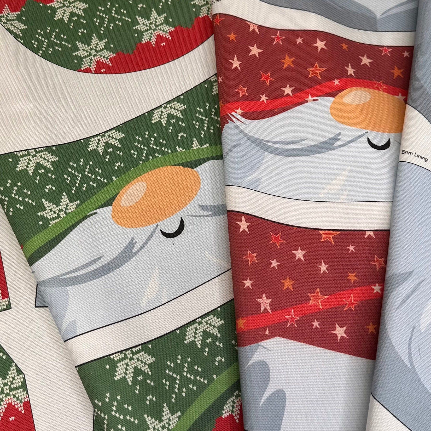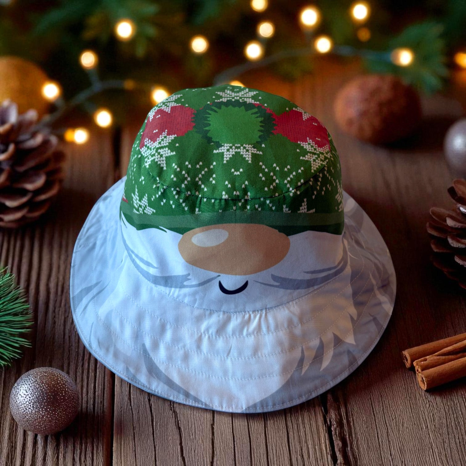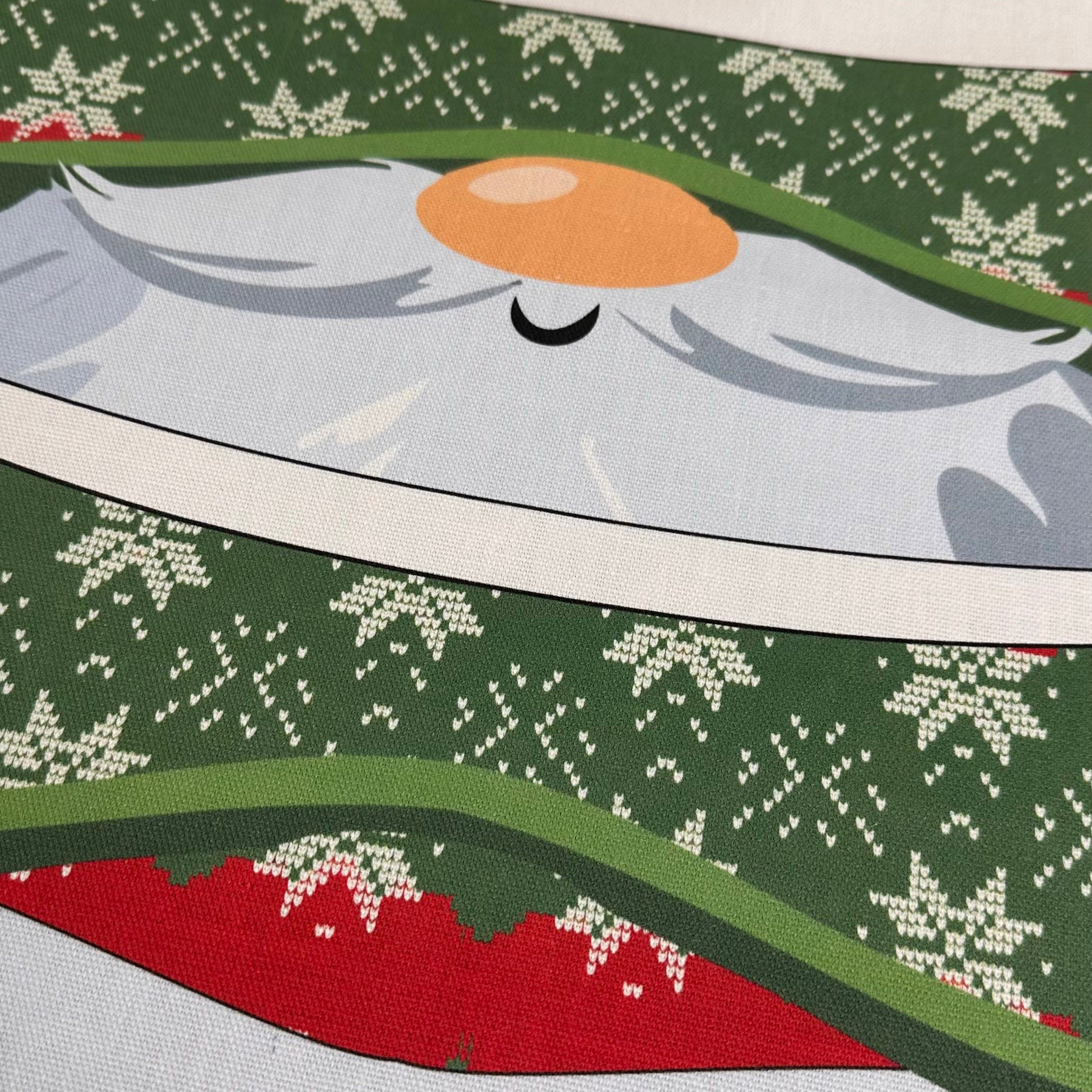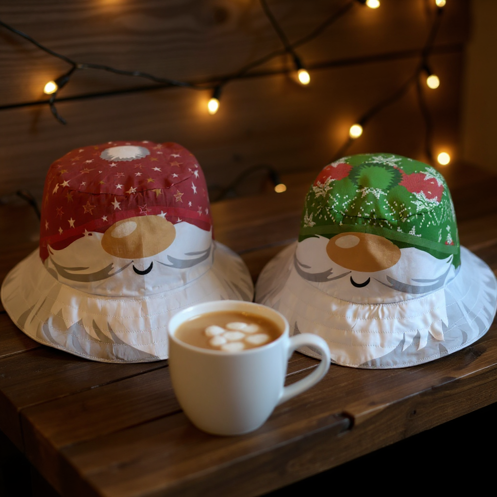 The Hat features featuring original Amber Makes illustrations of Father Christmas with his nose peeking out from under his red starry hat with a bobble on top and his beard forms the brim round the edge. The other side has Father Christmas wearing a traditional green Fair Isle style Hat.