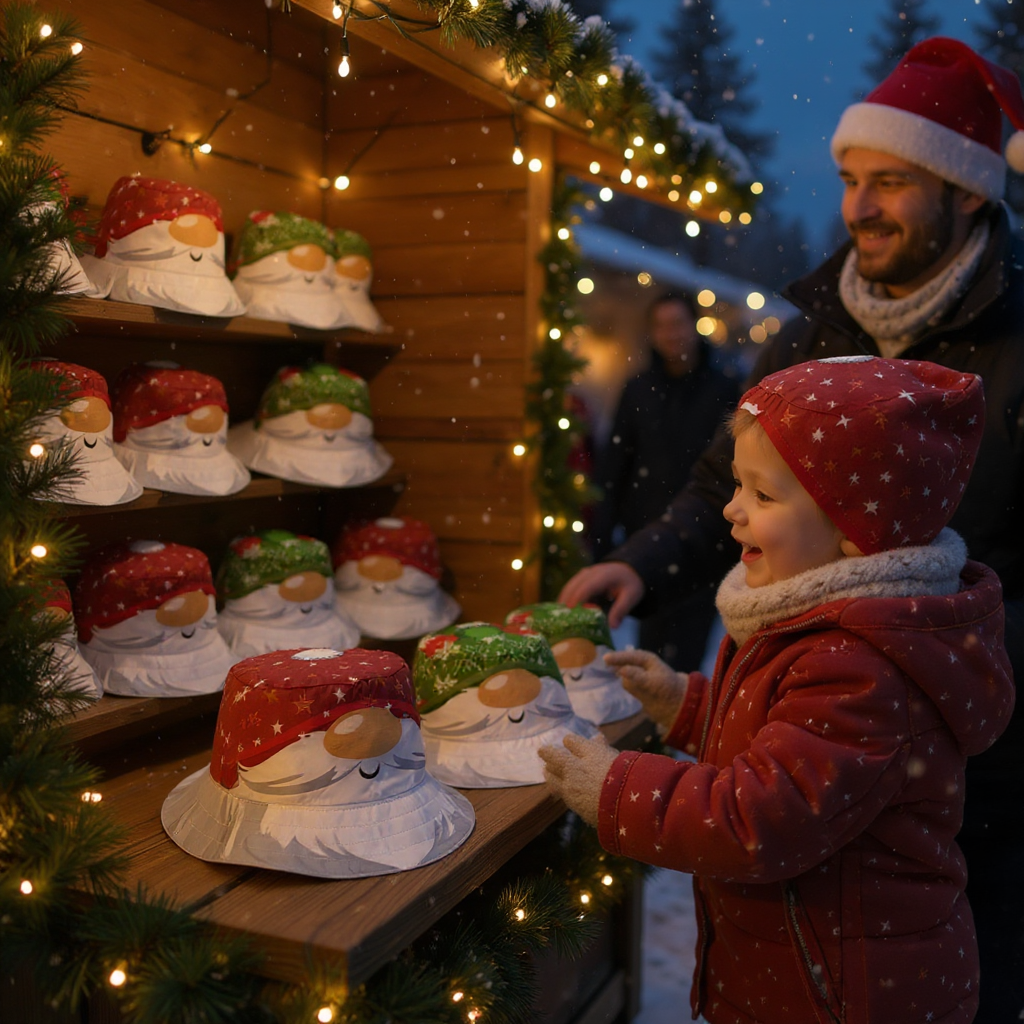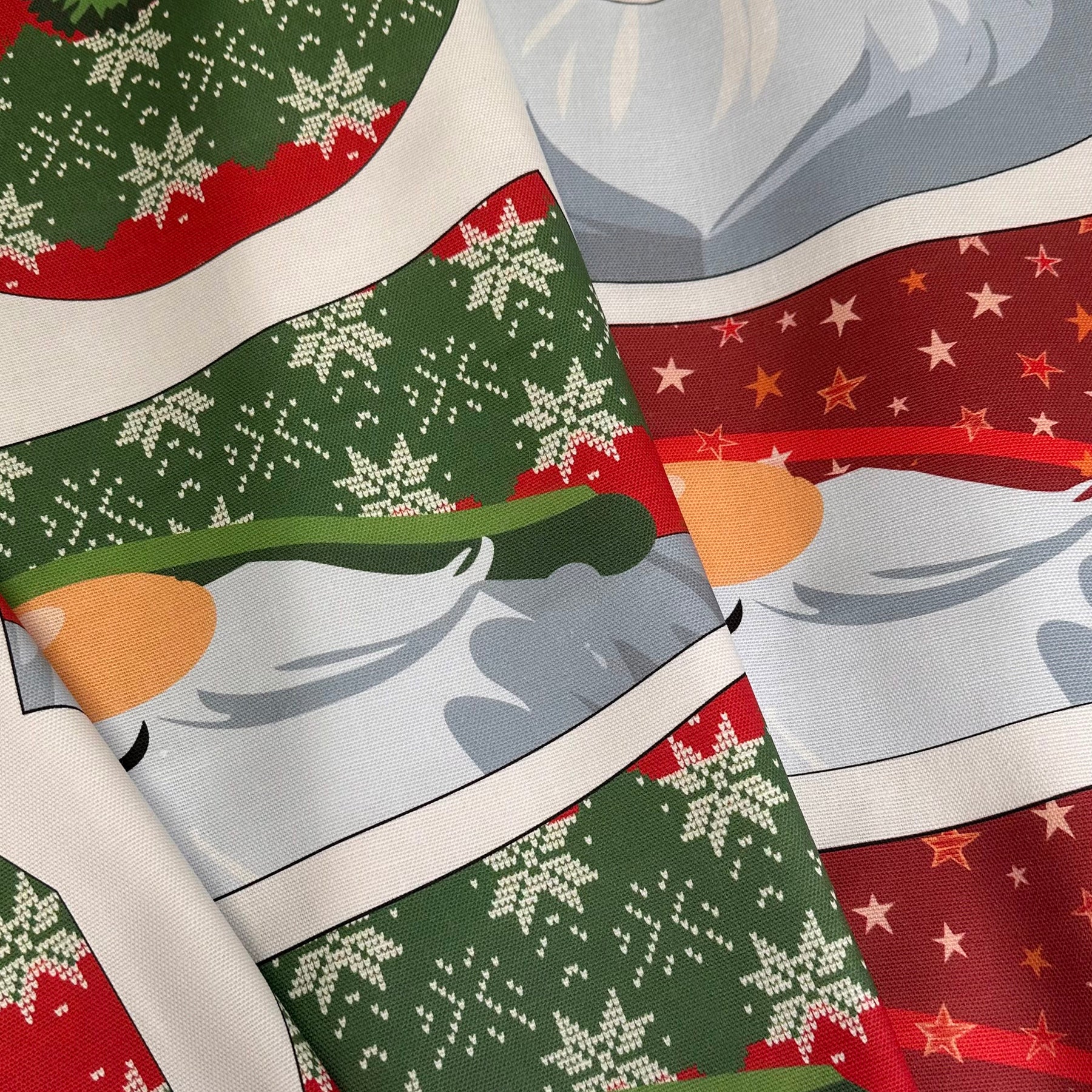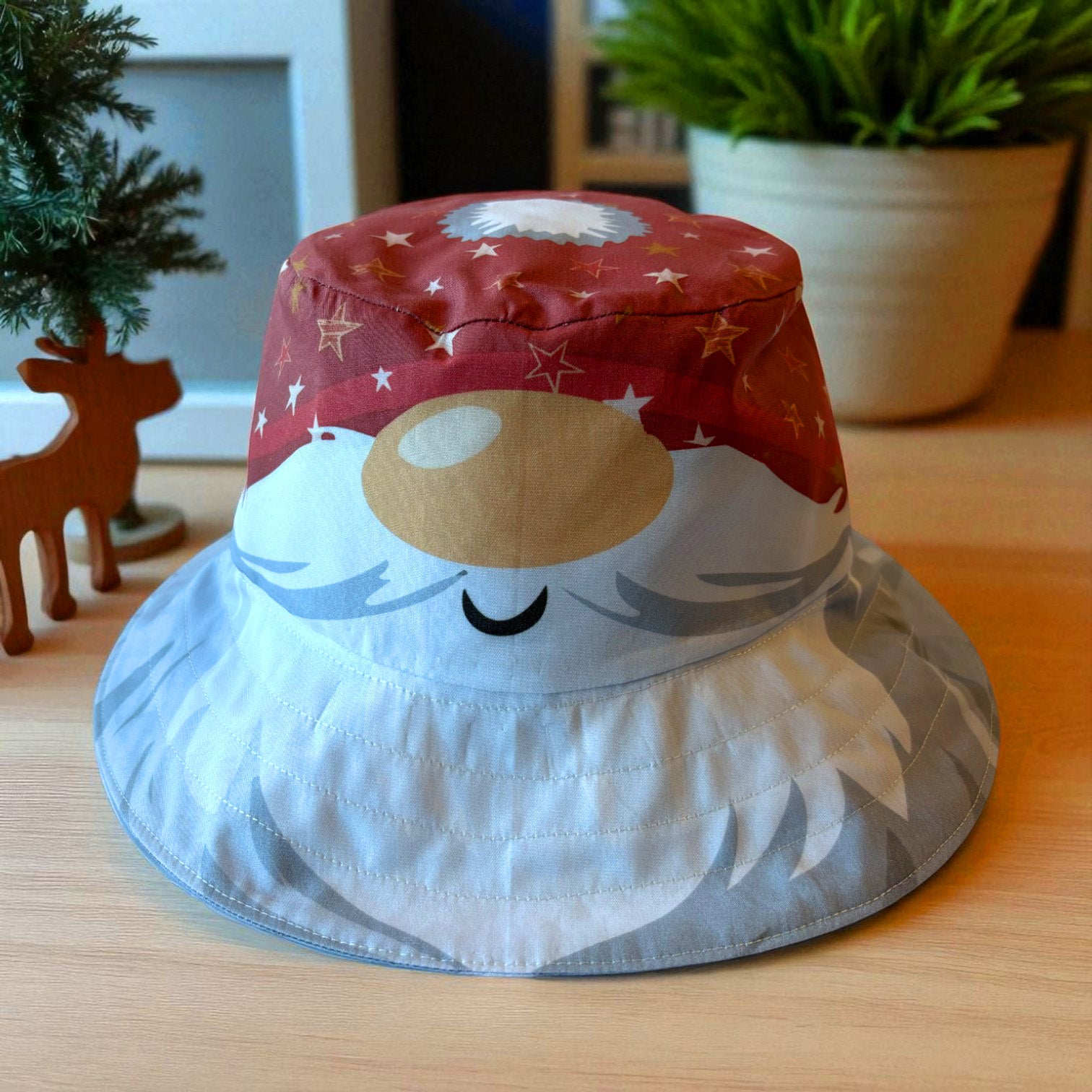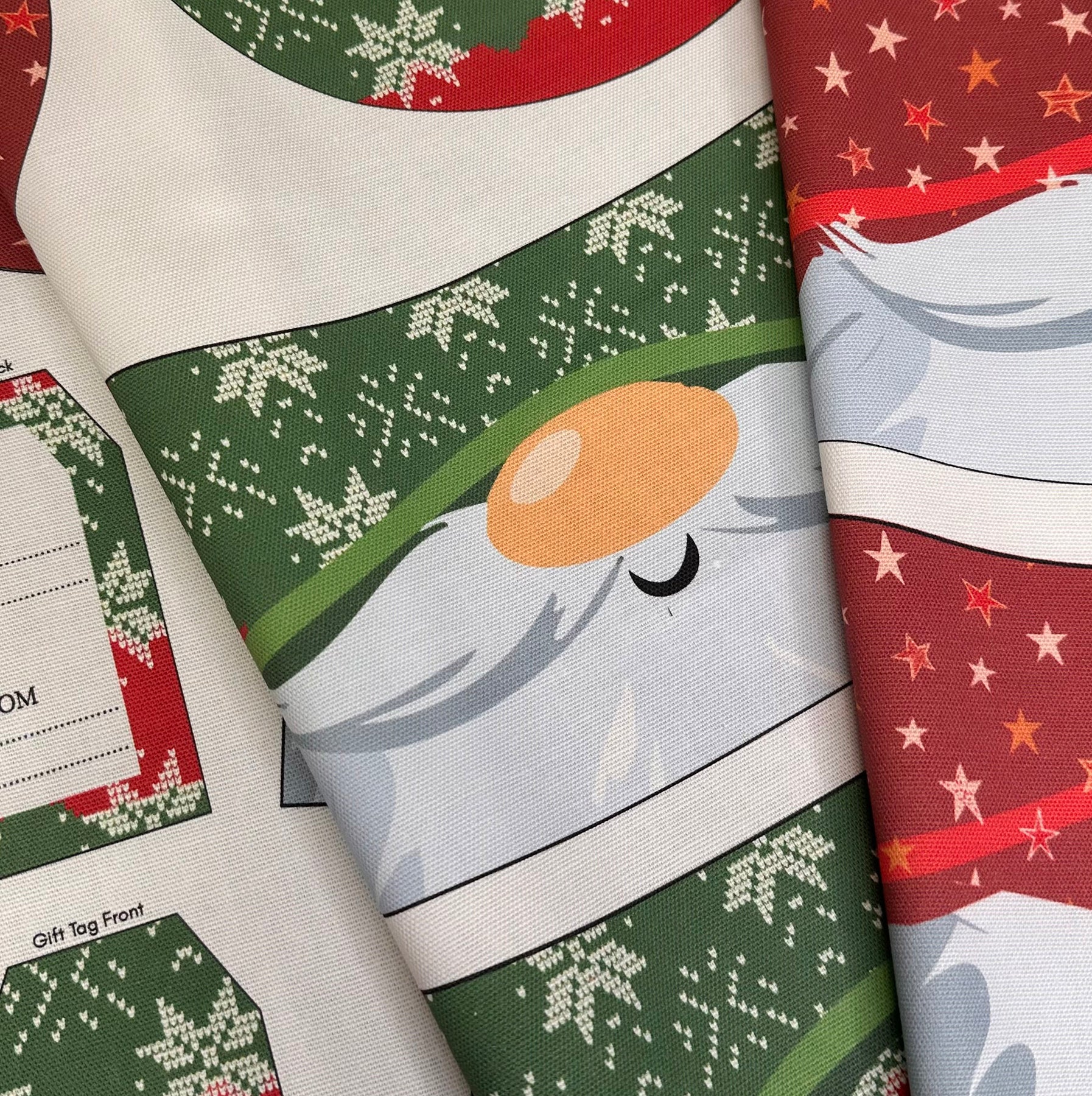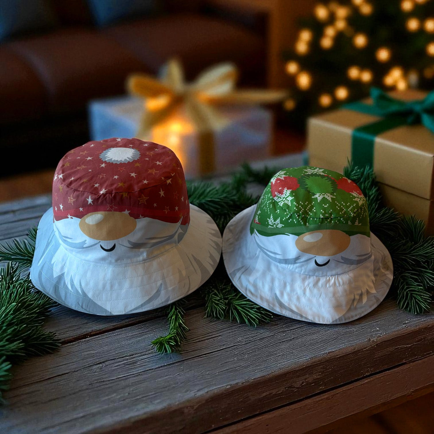 The Hat features featuring original Amber Makes illustrations of Father Christmas with his nose peeking out from under his red starry hat with a bobble on top and his beard forms the brim round the edge. The other side has Father Christmas wearing a traditional green Fair Isle style Hat.