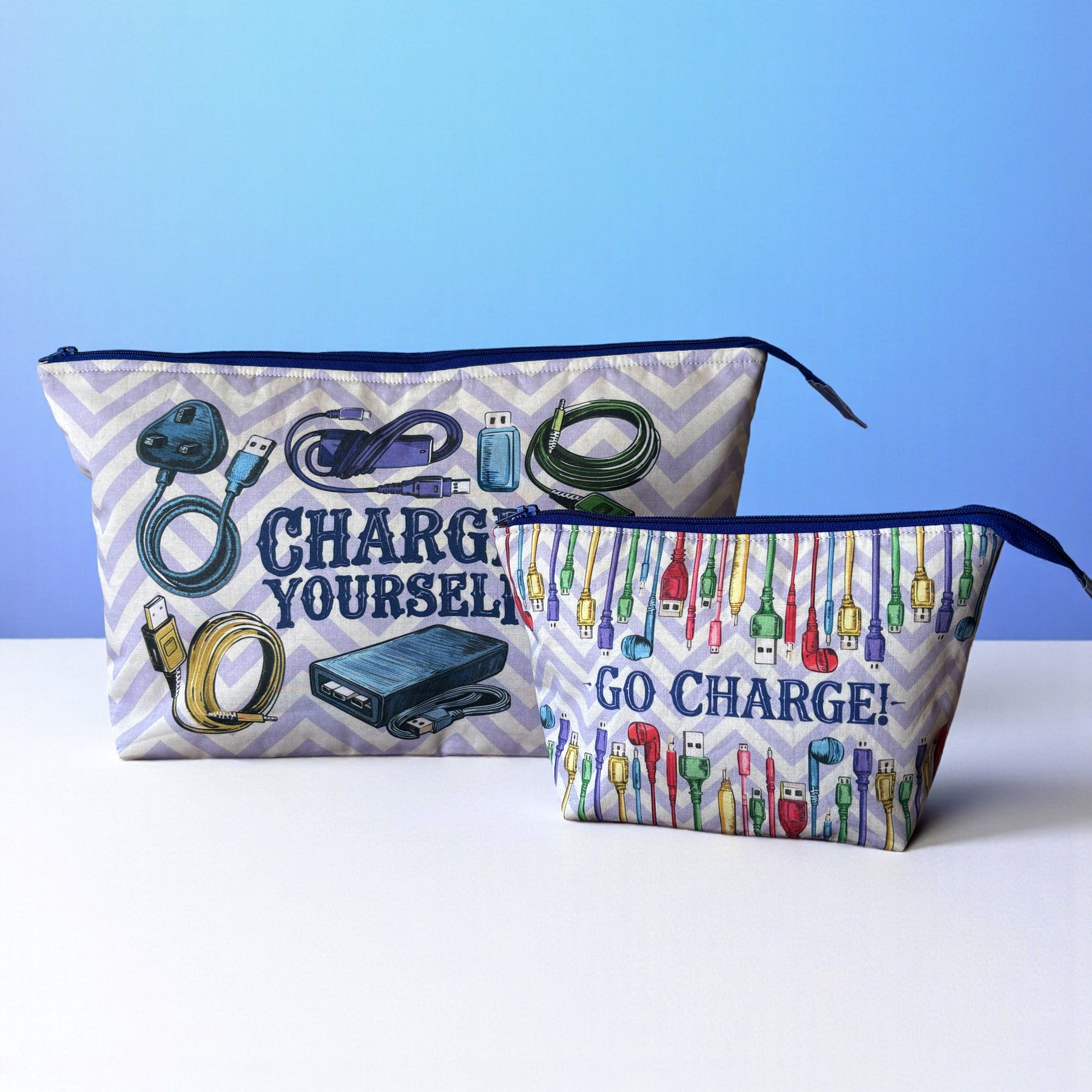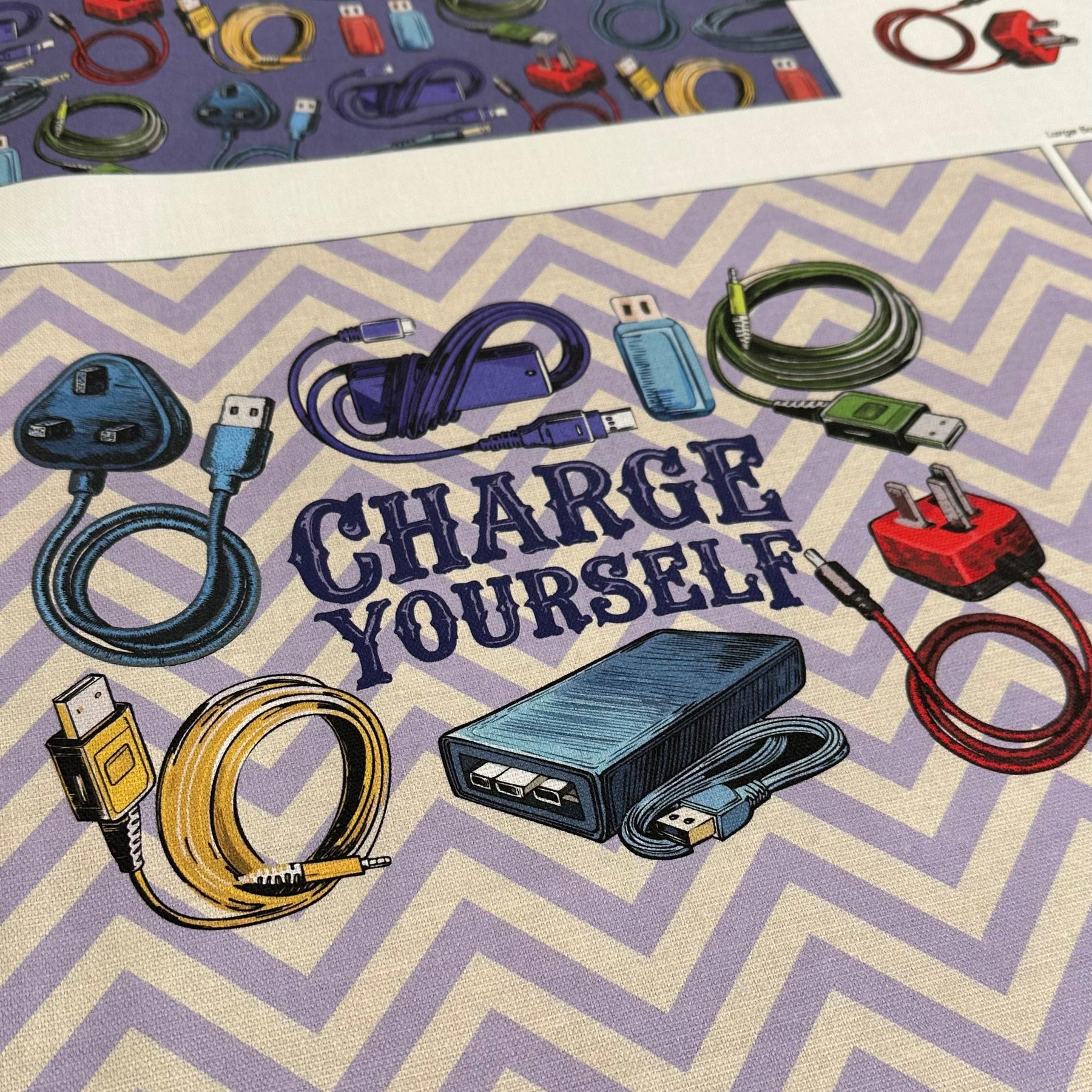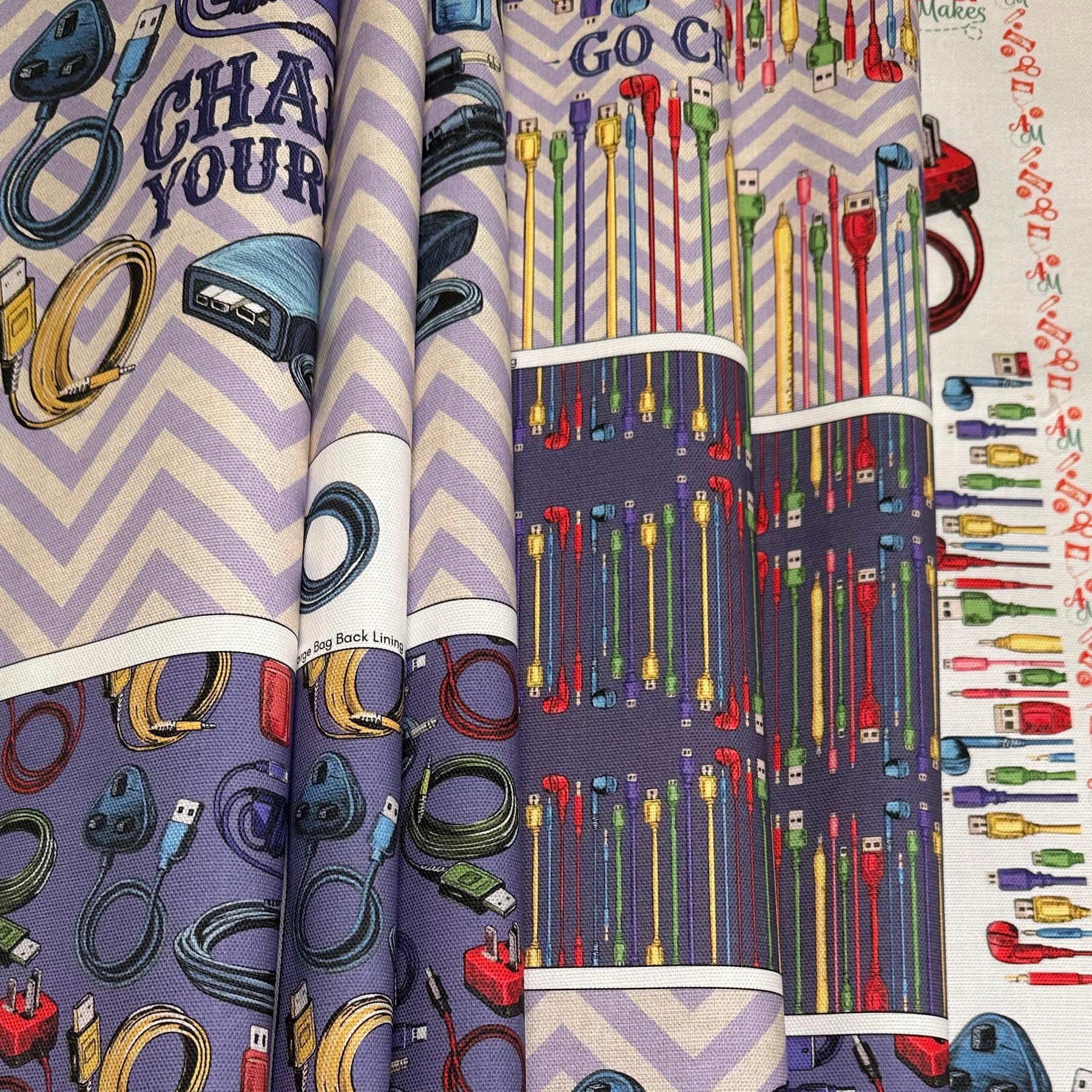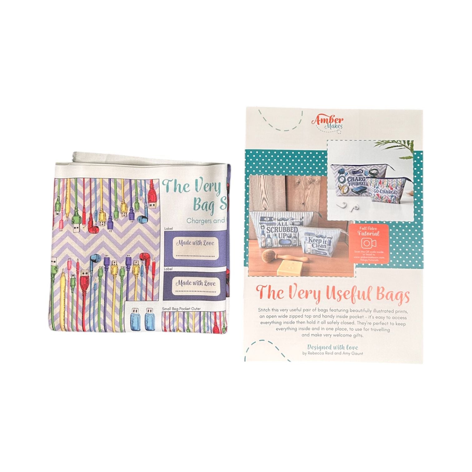 The printed fabric panel features original Amber Makes illustrations of chargers, plugs and cables.  It has all the pieces you need to make both bags with their matching pockets too - just cut out and sew together. The panel also includes the signature Amber Makes fabric labels. Clear, concise, full colour instructions with step-by-step photos are included to show you exactly how to make your very own set of Charge Yourself Very Useful Bags.