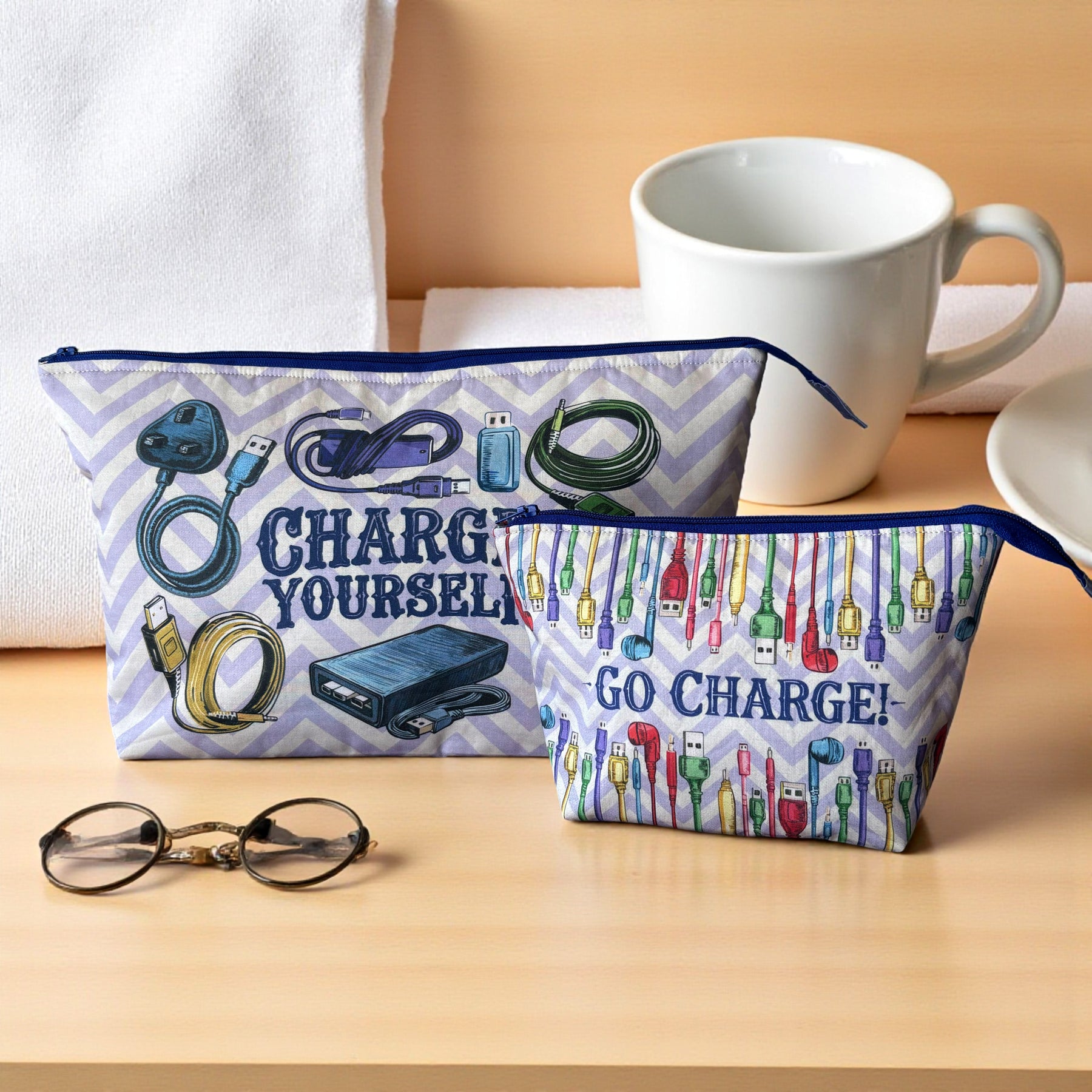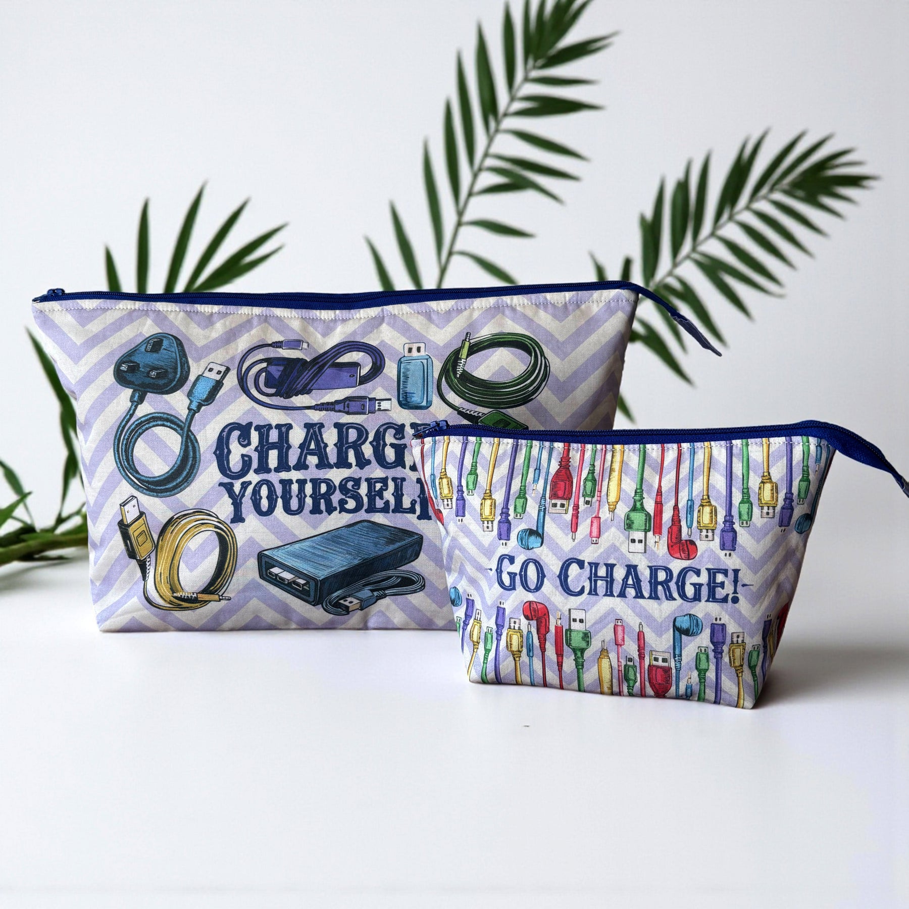 Stitch this very useful pair of bags featuring beautifully illustrated prints, an open wide zipped top and handy inside pocket – it’s easy to access everything inside then hold it all safely closed. They’re perfect to keep all your chargers, cables, plugs and electronic things inside. The larger pouch will fit a Tablet too. They’re ideal for organising and tidying all these things away, to use for travelling and make very welcome gifts too.